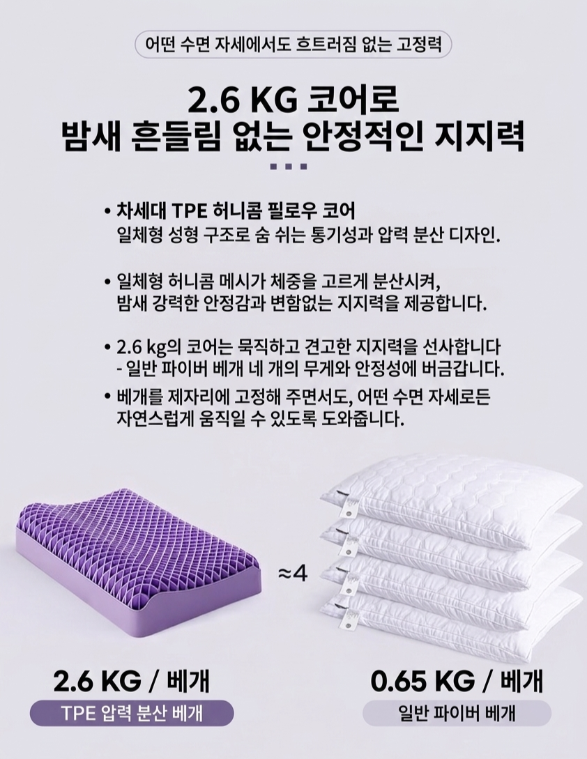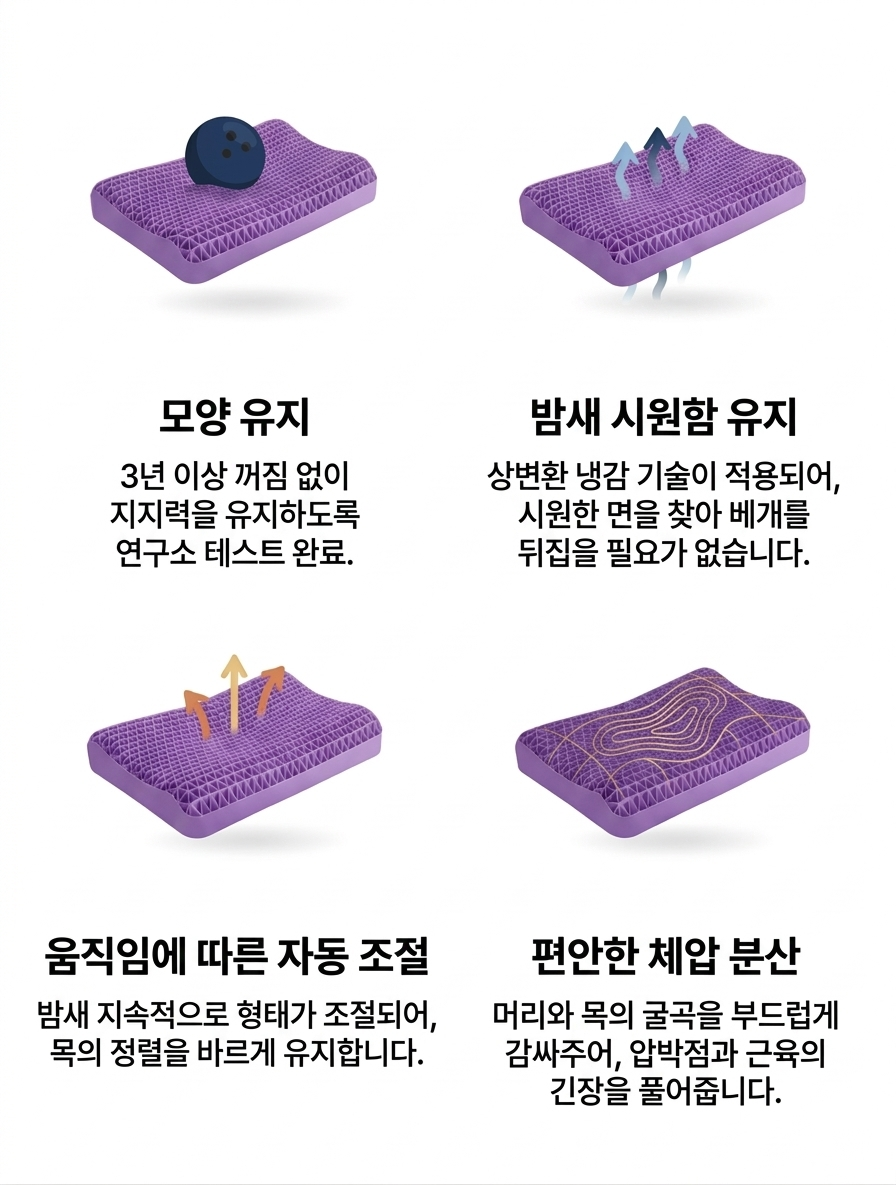이를 통해 압박이 집중되는 지점을 줄이고 공기 순환을 개선하여, 밤새도록 시원하고 편안한 수면 환경을 유지해 줍니다.