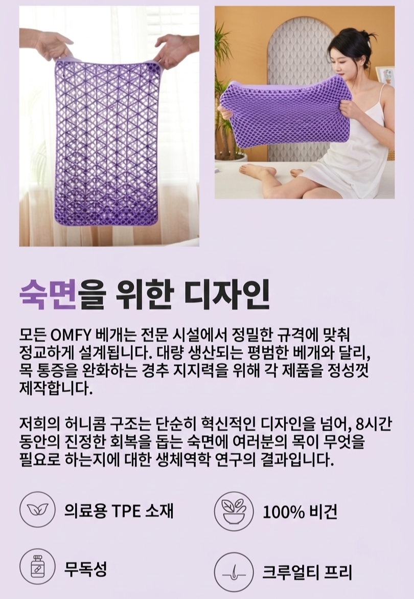COZZ는 움직임을 억지로 잡아두는 일반 베개와 달리, 머리와 목의 움직임에 자연스럽게 따라 움직이는 적응형 허니콤 TPE 구조를 사용합니다.
